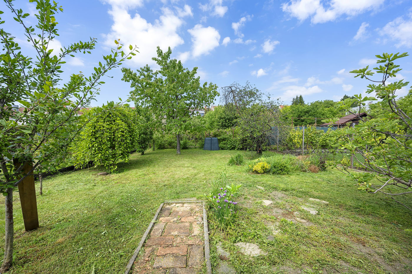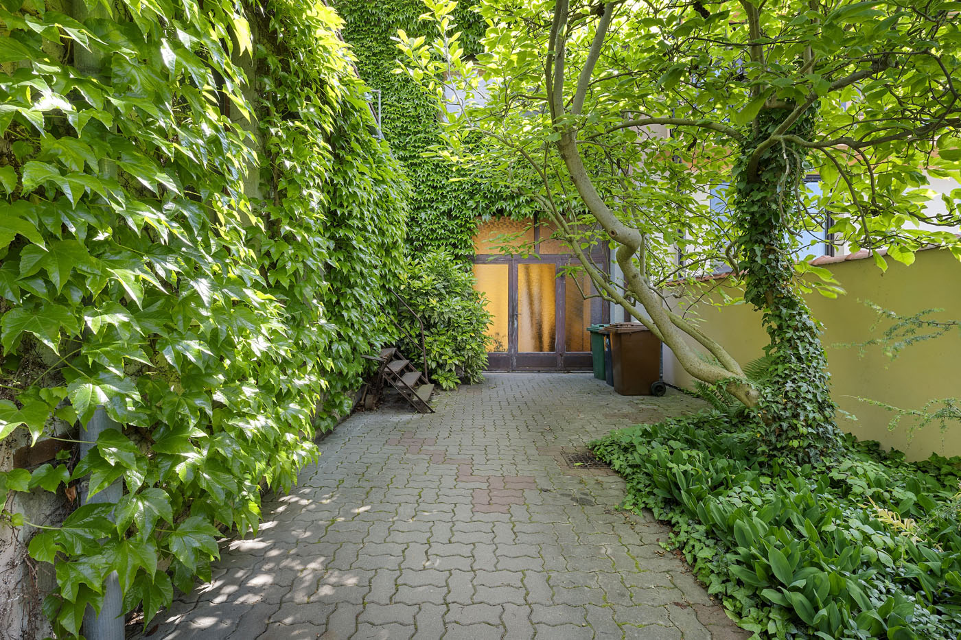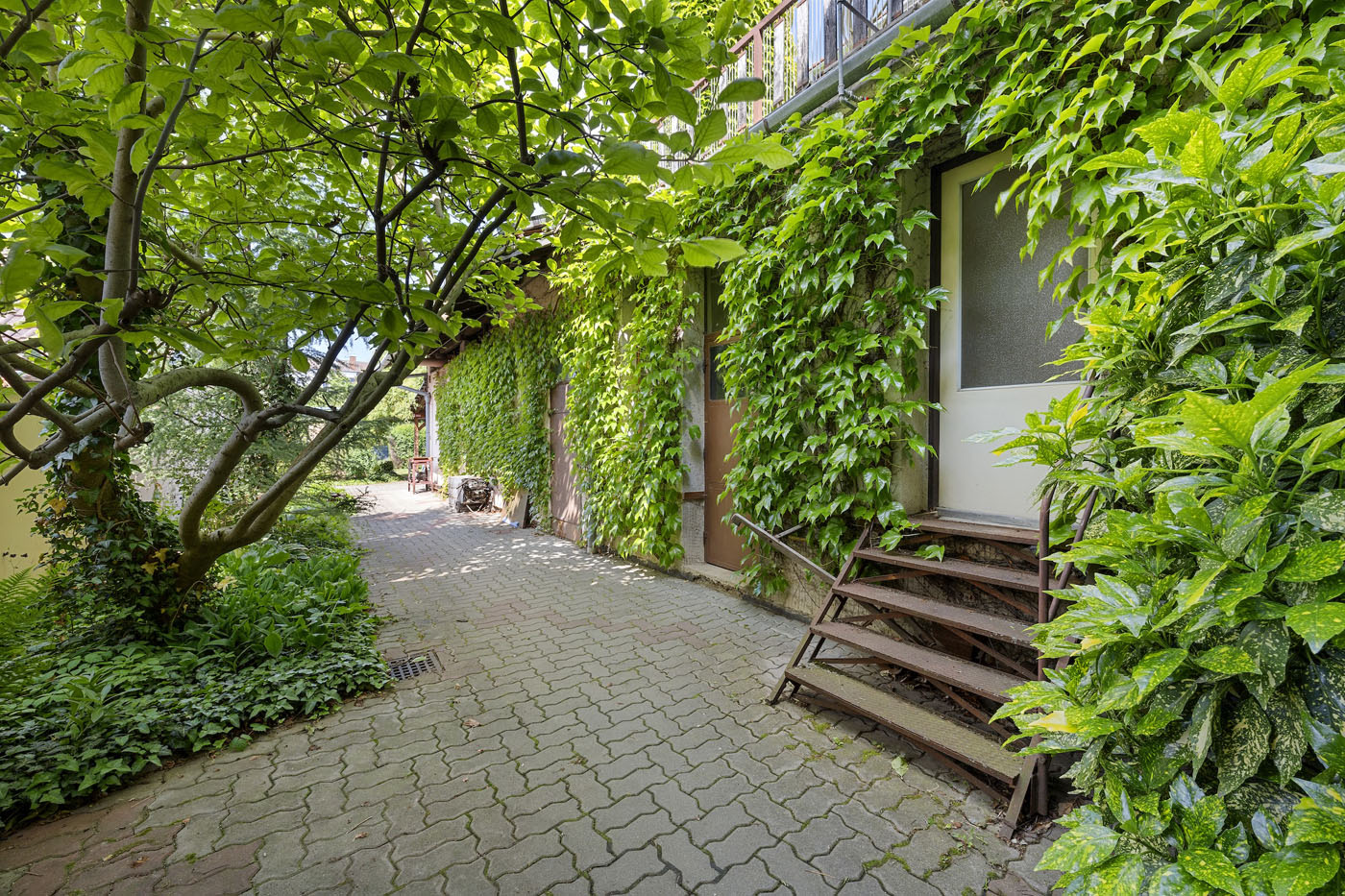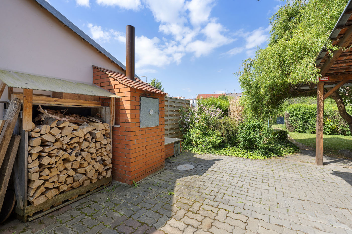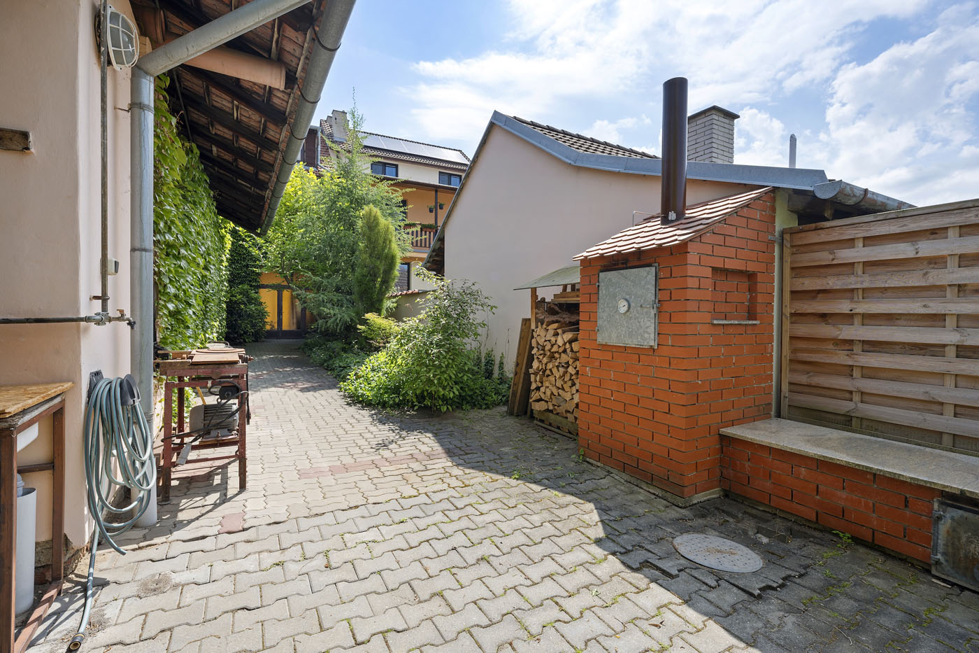 Ve dvorní části nemovitosti se nacházejí sklady a dílny. Ty jsou zakončeny krytým posezením. Dále pokračuje zahrada s jezírkem, ovocnými stromy další vzrostlou zelení.