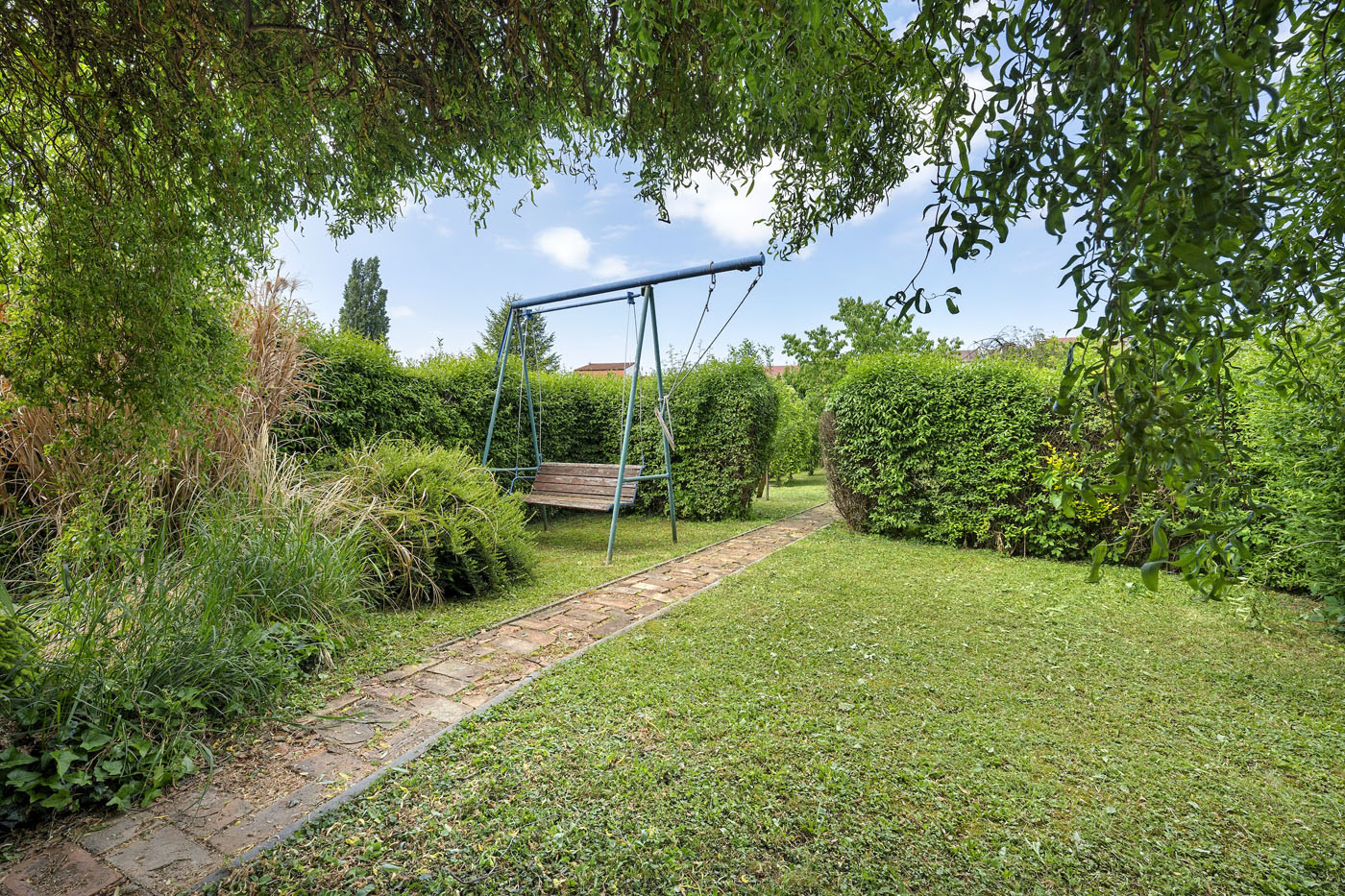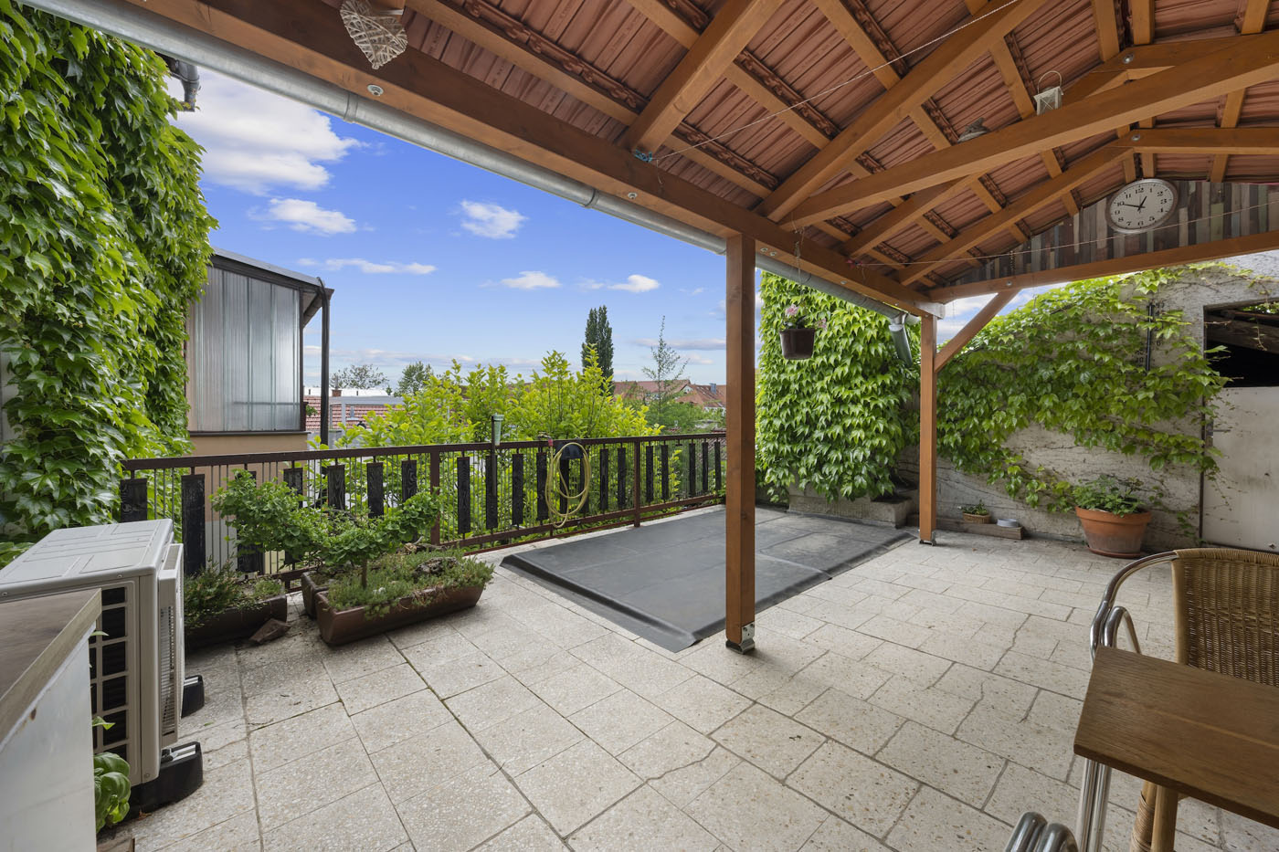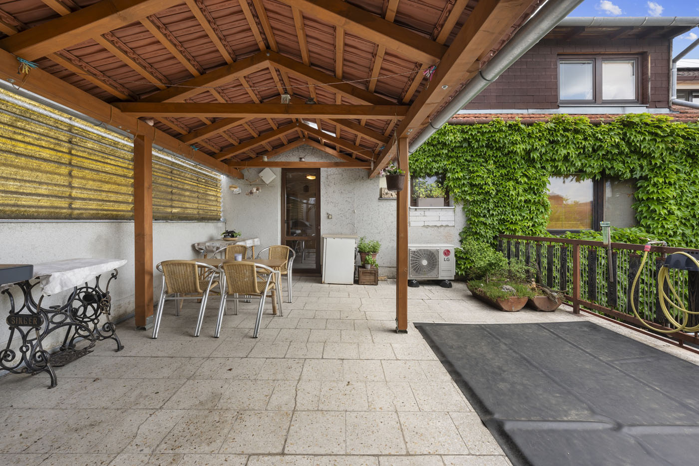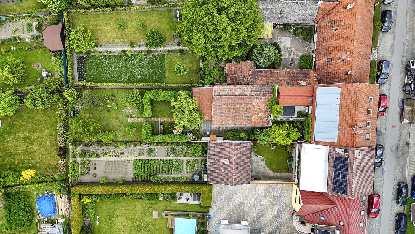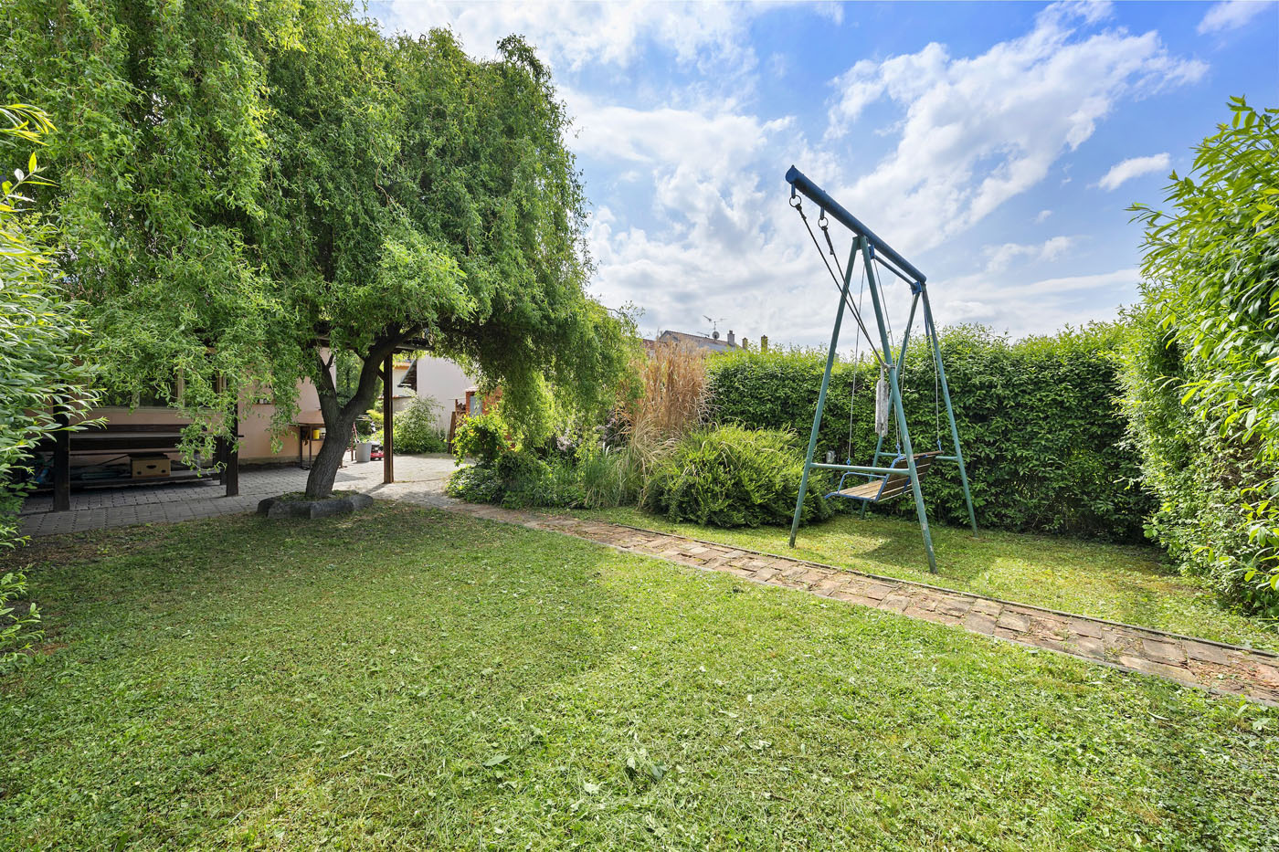 Ve dvorní části nemovitosti se nacházejí sklady a dílny. Ty jsou zakončeny krytým posezením. Dále pokračuje zahrada s jezírkem, ovocnými stromy další vzrostlou zelení.